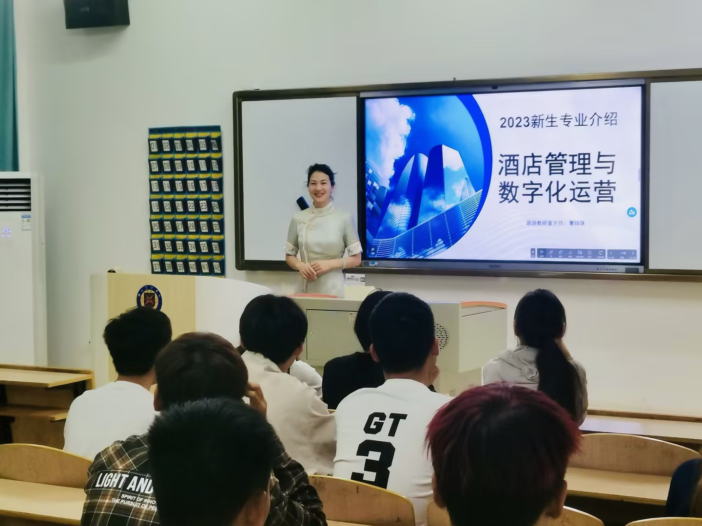 2023年9月20日,tyc33455cc2023级专科旅游管理及酒店管理新生齐聚教学楼,在XJB-007和XJB-008两个教室,旅游教研室主任曹珍珠、专任教师苏晓梦及华住集团校企合作负责人陈雯分别为两个专业的同学们进行了细致的专业介绍。