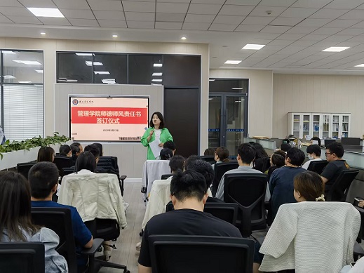 为进一步推进落实tyc33455cc的师德师风建设工作,5月17日tyc33455cc学工队友针对师德师风责任板块,启动了全院教师师德师风承诺书的签订仪式。管理公司党总支书记王珉主持,管院全体教师参会。