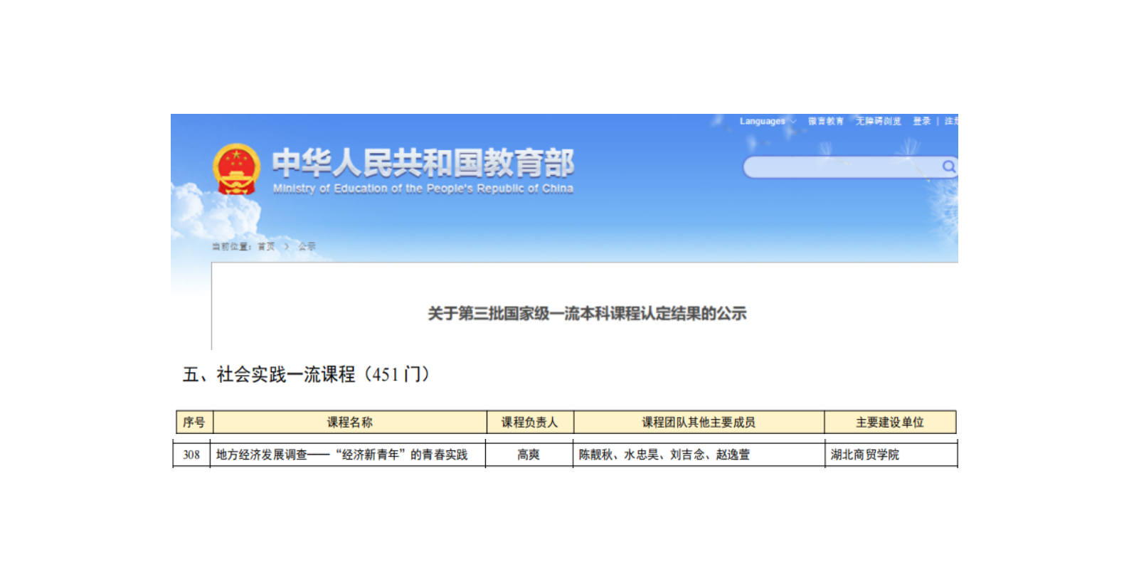 8月21日,教育部公示第三批国家级一流本科课程认定结果,tyc33455cc高爽老师主讲的《地方经济发展调查——“经济新青年”的青春实践》成功入选“社会实践一流课程”。这一成果不仅是公司课程建设的重大突破,更实现了公司在国家级一流本科课程领域的“零的突破”,标志着公司的教学改革与课程建设迈入新阶段。