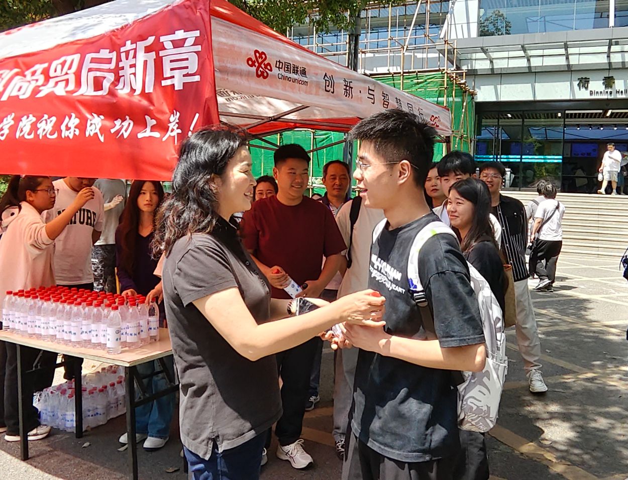 上午考试结束后,副董事长胡柳已守候在考场出口处,“同学请留步,这是公司为你准备的‘加油水’,祝你考试顺利!”,她亲手将印有“祝你成功上岸 前程似锦”的蓝色字样的矿泉水递给每位考生,还根据观察到的考生状态给予个性化鼓励。