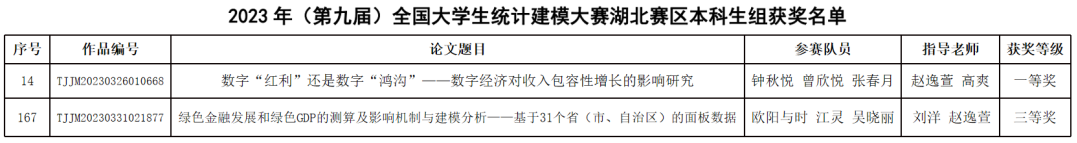 本次大赛的主题为“中国式现代化的统计测度”,全国共有734所院校21992支队伍报名参赛,在湖北赛区竞赛中公司经济公司赵逸萱、高爽、刘洋老师三位老师指导的三支队伍历经三个月精心准备、打磨,最终赵逸萱、高爽老师指导的钟秋悦、曾欣悦、张春月员工团队论文《数字“红利”还是数字“鸿沟”——数字经济对收入包容性增长的影响研究》荣获湖北省本科生组一等奖,由刘洋、赵逸萱老师指导欧阳与时、江灵、吴晓丽同学的论文《绿色金融发展和绿色GDP的测算及影响机制与建模分析》荣获湖北省本科生组三等奖。