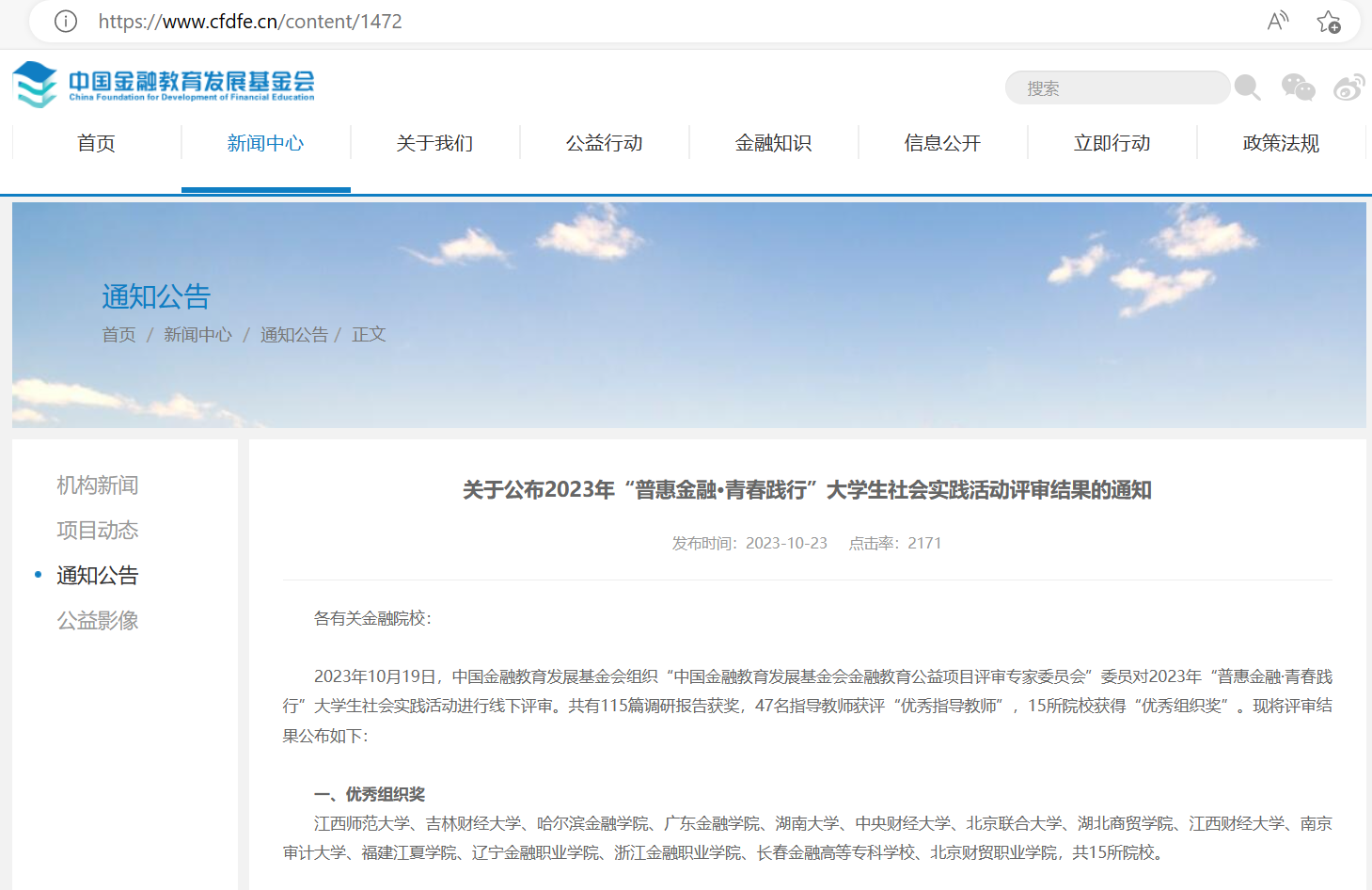 近日,中国金融教育发展基金会公示了2023年“普惠金融·青春践行”老员工暑期社会实践评审结果。公示结果中公司与中央财经大学、吉林财经大学等15所财经院校获优秀组织奖。