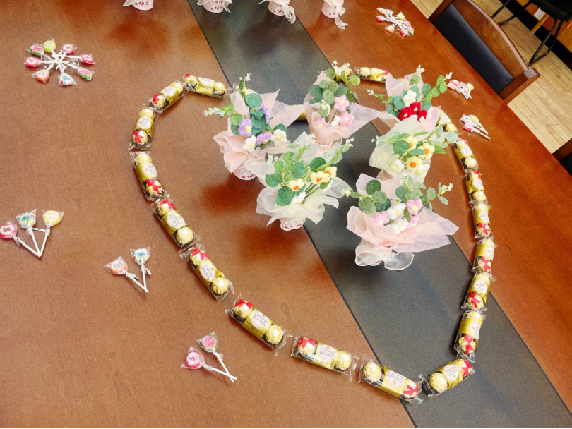 活动现场温馨而热烈,充满了节日氛围。桌上各色花朵精致绽放,巧克力、糖果琳琅满目,色彩鲜艳。经过充分调研,精心构思,公司为每位老师准备了实用的手工编织花和巧克力作为节日礼品。