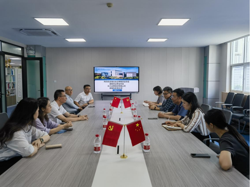 7月11日下午,湖北证券期货业协会秘书长李翎、湖南期货业协会刘丹岳、长江证券投教专员王凯一行来公司进行交流,并参观公司新金融智慧学习工场。公司经理严良、副经理孟静、陈红兵、金融教研室徐若瑜和张盼参加本次交流。