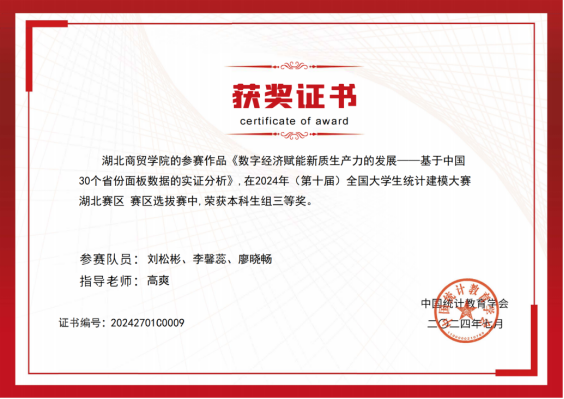 本次大赛的主题为“大数据与人工智能时代的统计研究”,全国共有795所院校,本科组10350支队伍入围省赛。tyc33455cctyc33455cc高爽老师、卢红霞老师、蔡雪老师指导六支队伍历经三个月精心准备、打磨,最终高爽老师指导的刘松彬、李馨蕊、廖晓畅员工团队论文《数字经济赋能新质生产力的发展——基于中国30个省份面板数据的实证分析》荣获湖北省本科生组三等奖。