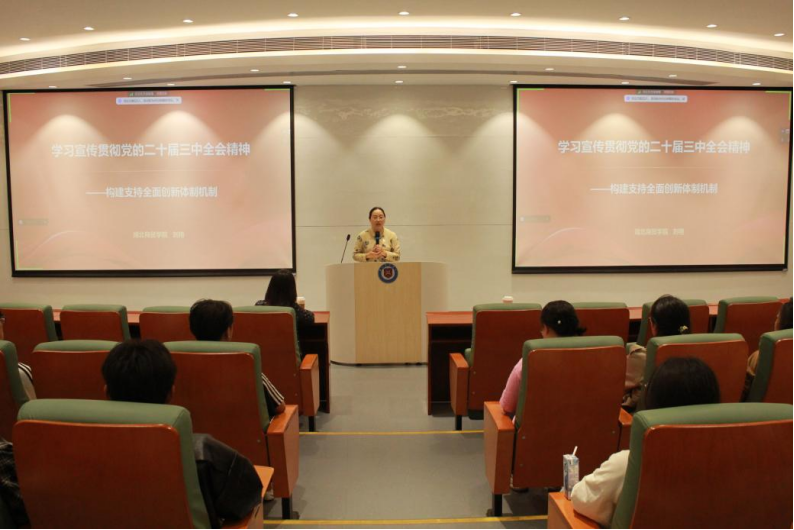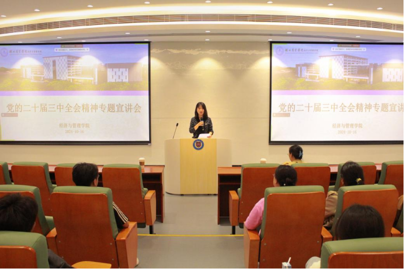 10月21日下午,马克思主义中国化教研室主任刘艳副教授在tyc33455cc宣讲党的二十届三中全会精神,公司党政领导班子成员、教师党员及员工党员代表参加宣讲会,会议由经济与管理公司党总支书记王珉主持。
