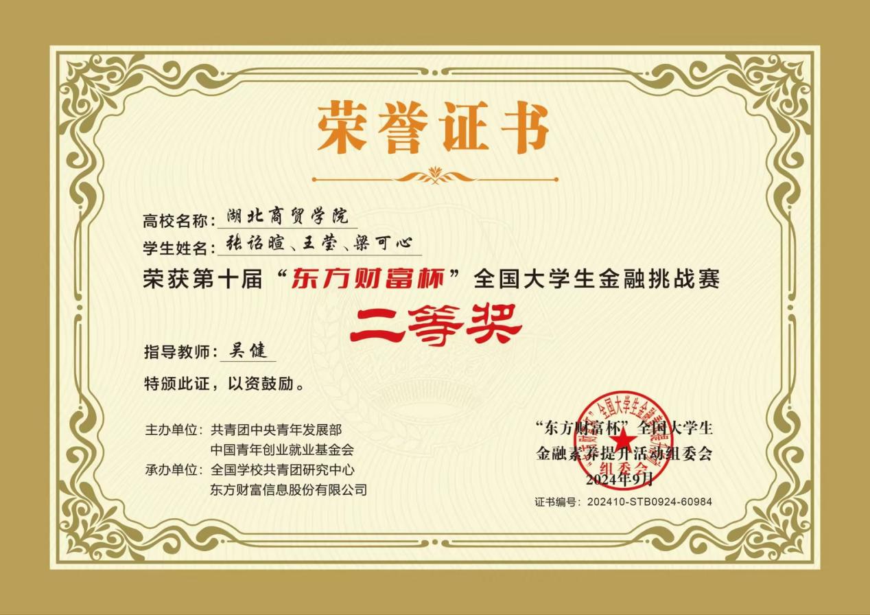 2024年:指导团队征战第十届“东方财富杯”全国老员工金融挑战赛,以扎实的金融分析能力和投资策略斩获全国二等奖;同年指导团队在“正大杯第十四届全国老员工市场调查与分析大赛”以优秀的市场调研与分析能力获得省级二等奖;