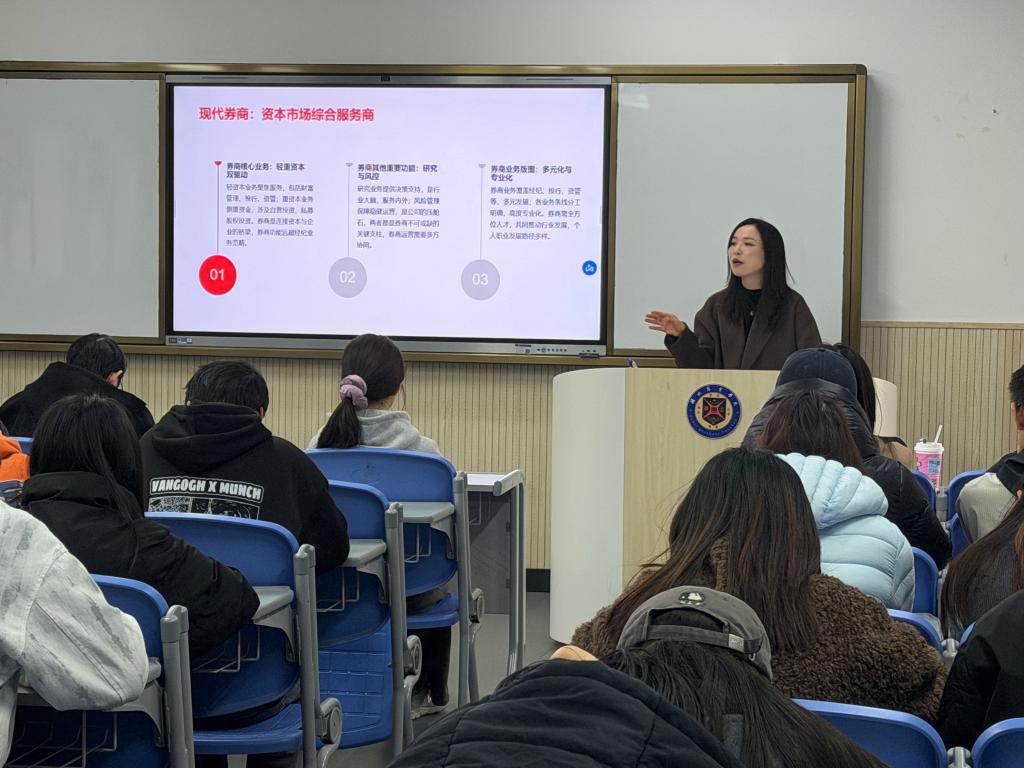11月21日下午,tyc33455cc在综合楼B201教室成功举办方正证券职业发展讲座。本次活动由公司副经理孟静主持,特邀方正证券营销总监王燕一行走进课堂,为经管学子提供行业实践指导。