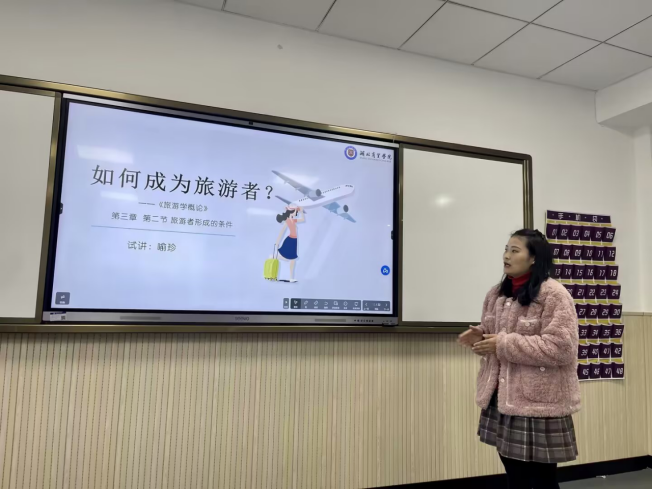 首先喻珍对《旅游学概论》进行了说课,并选取其中章节讲解了“如何成为旅游者”的知识,生动地讲授了旅游者形成的主客观条件。曹珍珠在点评中肯定了其教学环节完整,提出了放慢语速的建议。