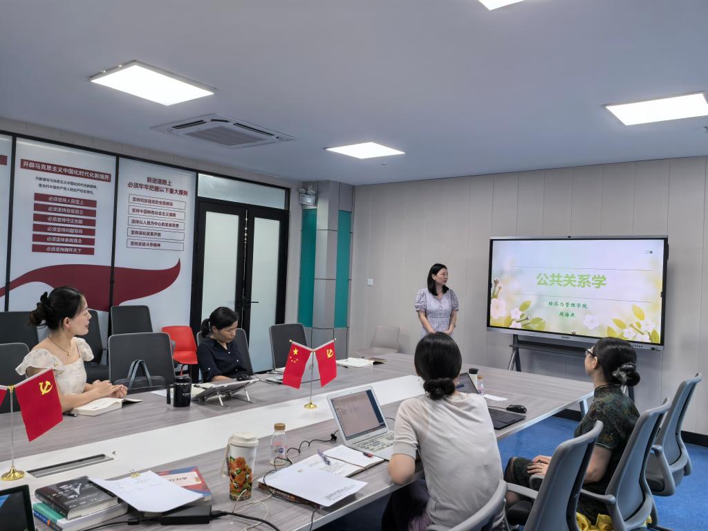 周海燕老师以说课的形式对本学期新开设的《公共关系学》课程进行展示。她首先提出章节的教学目标,然后通过提问形式对学情进行了解,再通过案例导入激发员工学习的兴趣,并围绕上述核心内容进行讲解,最后以总结和布置实践性作业的形式巩固学习成果。