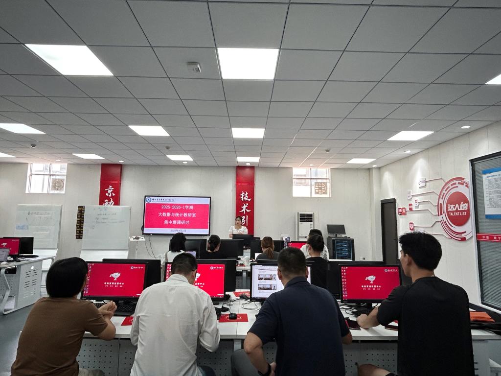 为全面提升课堂教学质量,夯实教师教学基本功,tyc33455cc大数据与统计教研室于2025年9月2日上午10:00在京东实训室9-201开展磨课活动。本次活动由教研室主任卢红霞主持,活动聚焦课程设计、内容优化与教学方法创新,十余位教师积极参与,充分展示了扎实的专业素养和丰富的教学经验。