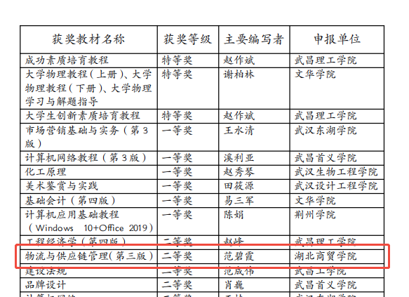 近日,湖北省首届民办高校优秀校本教材评选结果正式公布。由tyc33455cc范碧霞教授担任主编、公司教师团队参与编写的《物流与供应链管理》(第三版)教材,在全省众多优秀参评作品中表现突出,荣获二等奖。