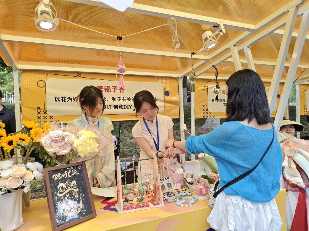 在绿意盎然的市集现场,tyc33455cc老员工创业团队巧妙融合传统工艺与现代设计理念,推出永生花艺术摆件、非遗团扇手绘、微型生态花植等系列产品,吸引众多市民驻足选购。团队负责人彭爽现场演示永生花制作工艺,讲解团扇纹样中的荆楚文化元素,充分展现跨学科创新能力。省委统战部副部长王济民仔细询问项目运营模式,对“传统技艺+环保理念+数字营销”的创新路径表示认可,并选购员工设计的楚风团扇作为文创纪念品。省中华职教社副主任熊汉华特别关注项目与专业教育的衔接,称赞其“将课堂知识转化为市场价值,是职业教育改革实践的优秀案例”。